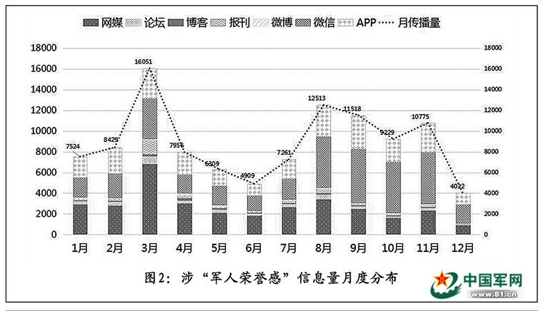 就涉“军人荣誉感”信息的月度传播来看,月均传播量达9316篇,3月、8月、9月、10月、11月信息量都超过均值。整体看,下半年舆情保持高位。期间,习主席在中央军委政策制度改革工作会议上强调认清推进军事政策制度改革重要性和紧迫性建立健全中国特色社会主义军事政策制度体系、建军节主题宣传活动、“最美退役军人”评选活动、扫雷战士杜富国被炸伤引发全社会关怀等热点迭出,舆论场正能量集聚。