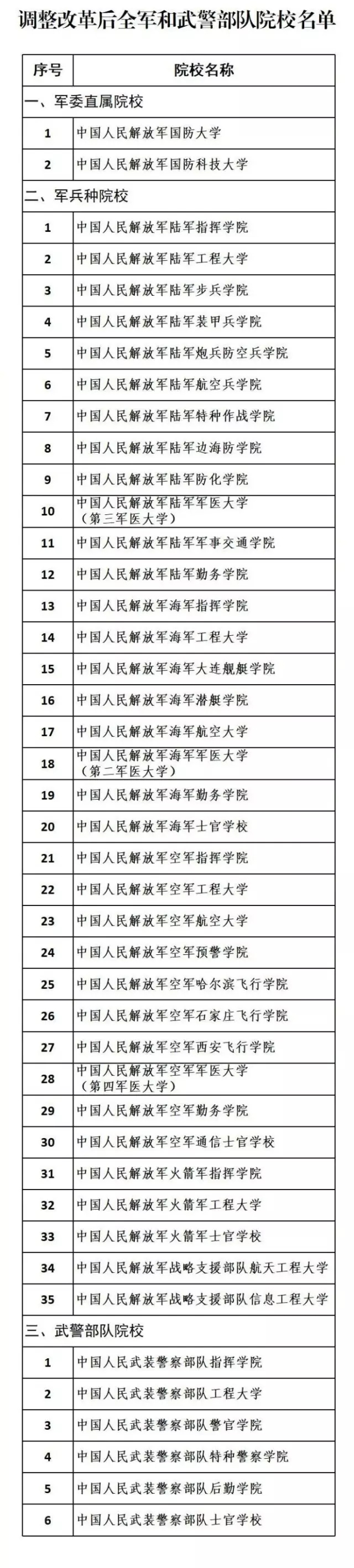 吴谦说,这次军队院校调整改革,对院校结构布局进行了调整,基本形成以联合作战院校为核心、以兵种专业院校为基础、以军民融合培养为补充的院校布局。关于具体院校名称,大家可以看一下大屏幕。从大屏幕上可以看到,军委直属院校2所,军兵种院校35所,武警部队院校6所,总共43所。接下来,我们会在国防部网站和国防部官微发布这份院校名录。