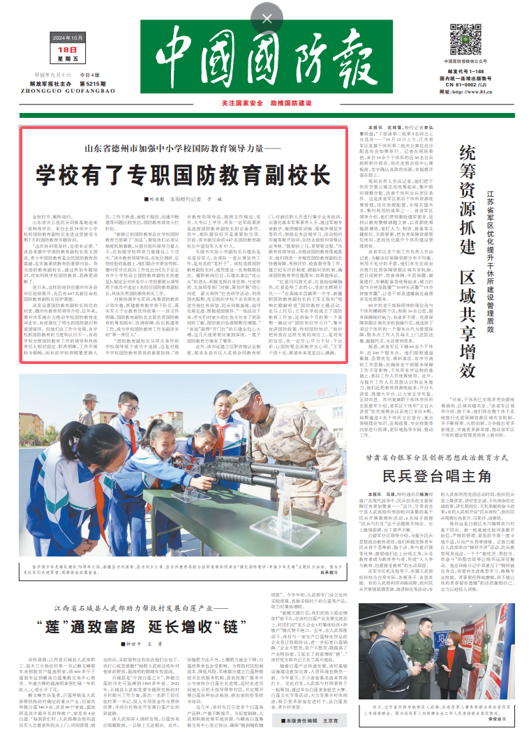 “新修订的国防教育法在学校国防教育方面做了‘加法’,督促我们必须从制度机制着眼,从强化组织领导力量入手,在加强学校师资力量建设上下功夫。”该市教育局领导说,在充分调研、总结经验的基础上,他们联合市委宣传部、德州军分区政治工作处出台《关于在全市中小学校设立国防教育副校长的意见》,规定全市所有中小学校都要从领导班子成员中选定1名担任国防教育副校长,具体负责国防教育相关工作。
