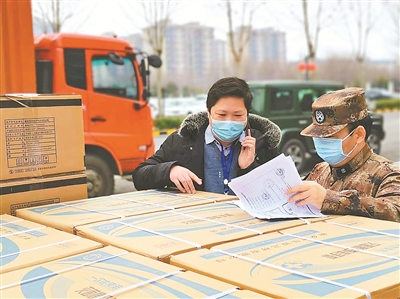 上图:长垣市人武部对发往武汉的物资进行检验。赵东甫摄