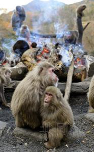 除泡温泉之外,日本猴还通过围着篝火的方式取暖。按照惯例,日本爱知县犬山市的日本猴主题公园展示了日本猴依偎在篝火边的场景。