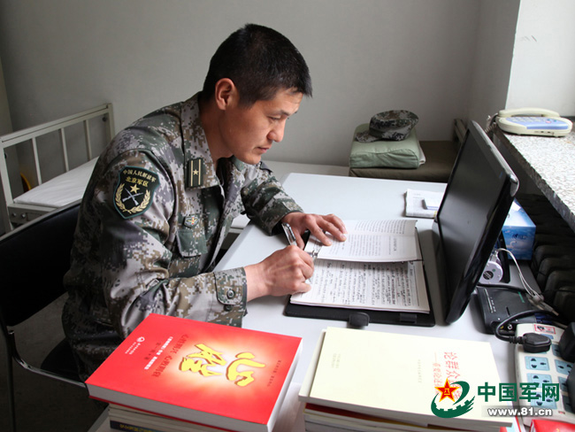 在李彦岗的书柜和办公桌上,几十本厚厚的摆放整齐的各类书籍、十几本读书笔记见证了他的学习热情和求知欲望。他不仅爱看法律、军事装备方面的书籍,还喜欢看历史类、管理类的书。装甲兵训练非常艰苦,“一天二两土,白天不够晚上补” 说的就是装甲兵的辛苦。为了挤时间学习,他白天一心扑在工作上,利用晚上熄灯后的时间看书,经常到深夜。夏天在野外驻训时,帐篷内闷热,他就利用中午休息时间到树林里看书。为了利用所学法律专业知识为身边战友解决涉法问题,2001年,李彦岗通过自己的努力,取得了总政颁发的基层法律服务工作执业资格证书。十多年来,他为战友解决宅基地纠纷、亲属讨薪、人身伤害等法律纠纷问题数十起。