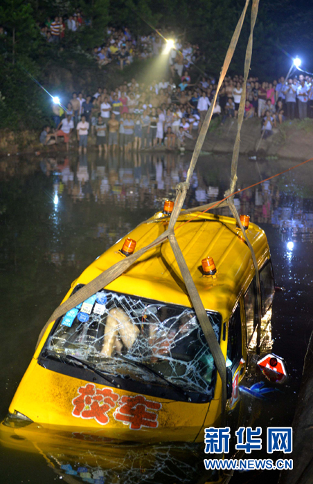7月11日,事故校车被吊出水面。 10日下午5时左右,湖南湘潭市雨湖区响塘乡金侨村乐乐旺幼儿园所属的一辆校车在送幼儿回家途中,经过与长沙市交界处的长沙岳麓区含浦街道干子村时翻入水塘。11日凌晨3时许,涉事校车被打捞上岸,确认造成11人遇难,其中幼儿8名。新华社记者白禹 摄