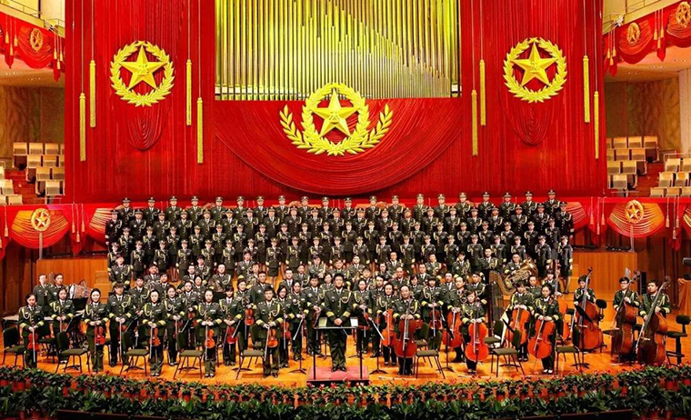 样式,男演出服与军乐团礼宾服相同,上衣为平驳领、单排四粒扣,袖口镶三道金黄色饰条。裤子为西式裤,裤侧缝镶金黄色饰条。大衣为开关领、双排六粒扣。女演出服上衣为平驳领、单排4粒扣;配西服裙(春秋)和西式裤(冬);大衣为双排6粒扣开关领。