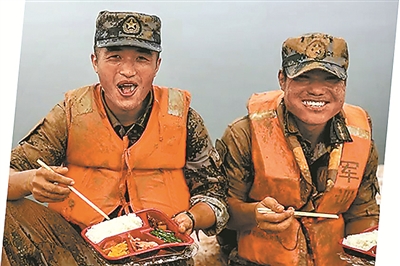 第72集团军某连官兵执行九江赛湖堤坝加固任务,连续奋战的连长曾昭伟(左)和指导员朱政(右)终于有空扒上一口热饭。面对镜头,一身泥水的两人露出了微笑。