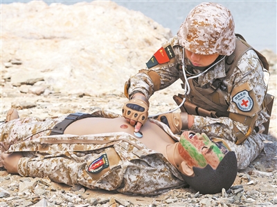 图①:在前不久的一次演习中,军医对“勇士”进行伤情诊断。