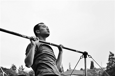 “往上拉,腰部用力,手抓住。”在战友们焦急的喊声中,黄玉龙紧握头顶的单杠,身体颤抖着往上挪。最终,还是因为体力不支落了下来。