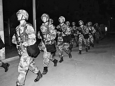 借着微弱的手电光,踏着坎坷不平的土路,队伍全副武装,快速行进。随着行程过半,行军进入了最艰难的阶段。到了小休息点,不少人用双手艰难地抬起大腿,让双脚得到短暂休息。3分钟后,全体人员迅速起身。此时,行程约剩7公里,时间只剩1小时。