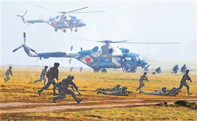 13时17分,我运输机群飞抵预定空域,天空随即绽放朵朵伞花,全副武装的空降战斗员直扑战场。2分钟后,4架直-10战机驭风飞来,时而垂直打击,时而俯冲攻击。紧接着,特战突击队搭乘4架米-171直升机实施机降索降,迅速抢占要点要地。