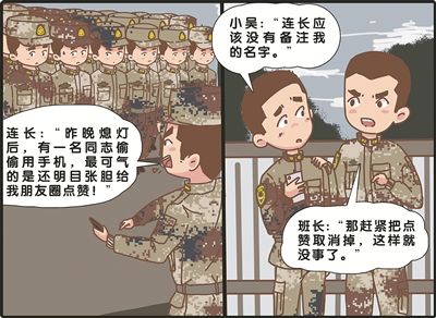 其实,诚如刘升所料,连长当时并没有注意到朋友圈的“点赞大军”里有小吴,然而在核实刘柯源登记备案时,他发现当晚以搜集素材为名领取手机的还有小吴,而小吴并未参与展板制作,一看便知他是趁机钻空子、搭顺风车。“我之所以在晚点名时没有说破,就是想看你们啥时候‘坦白’呢!”闻听连长的“小心思”,刘升和小吴都涨红了脸……