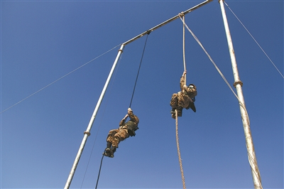 上图:该旅二号营区官兵利用新安装的攀登架训练。刘志祥摄