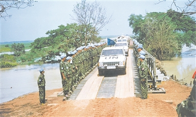 当天下午,联柬机构工兵处作战参谋巴巴亚也赶到斯昆,向我传达了联柬机构司令桑德森将军的命令:尽快修复桥梁,有困难尽管提。考虑到当地民众反映近期武装分子密集出没、桥区附近可能埋有地雷等,我要求联柬机构派出步兵分队和扫雷分队来支援。我保证,只要物资器材到位,一天之内就把这座桥架好。