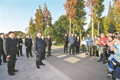 正在江边休闲散步的市民看到总书记来了,纷纷向总书记问好。习近平同大家亲切交流,对大家说,40多年前我来过五山地区,对这里壮阔江面的印象特别深刻。这次来,看到经过治理,曾经脏乱差的环境发生了沧桑巨变,成为人们流连忘返的滨江生态公园。大家生活在这样的城市里很幸福,幸福是你们共同奋斗、亲手创造出来的。习近平指出,城市是现代化的重要载体,也是人口最密集、污染排放最集中的地方。建设人与自然和谐共生的现代化,必须把保护城市生态环境摆在更加突出的位置,科学合理规划城市的生产空间、生活空间、生态空间,处理好城市生产生活和生态环境保护的关系,既提高经济发展质量,又提高人民生活品质。当前,境外疫情仍在蔓延,我国外防输入、内防反弹压力还很大。希望大家始终不放松疫情防控这根弦,继续落实各项常态化疫情防控措施,坚决防止疫情出现反复。
