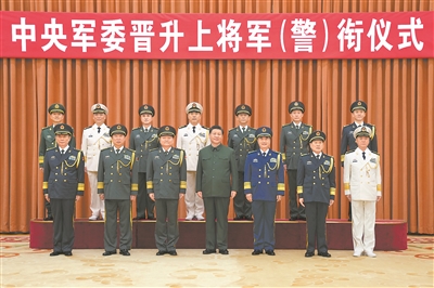 晋衔仪式在嘹亮的军歌声中结束。随后,习近平等领导同志同晋升上将军衔警衔的军官警官合影。