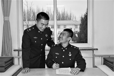 上图:即将休假的军士冯建龙(右)正在与杨鑫用休假路途时间计算公式计算路途往返时间。瞧,他们笑得多开心!金喜灿摄