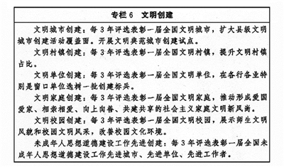 以实施文明创建工程为抓手,推动文明培育、文明实践、文明创建不断深入。创造性开展文明城市、文明村镇、文明单位、文明家庭、文明校园和未成年人思想道德建设工作先进等精神文明创建活动,拓展新时代文明实践中心建设。弘扬科学精神,深入开展爱国卫生运动,深化文明餐桌行动和“光盘行动”,倡导文明健康、绿色环保的生活方式。健全志愿服务体系,广泛开展志愿服务关爱行动。加强网络文明建设。(见专栏6)(见专栏7)