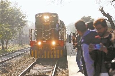 上图:1月27日,人们在巴基斯坦伊斯兰堡等待绿线特快列车组进站。