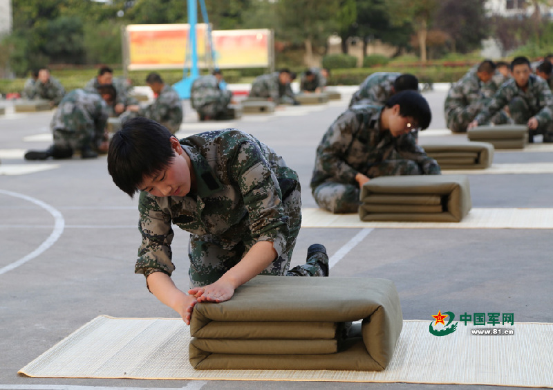 南京军区某部新兵营组织新兵叠军被比赛。