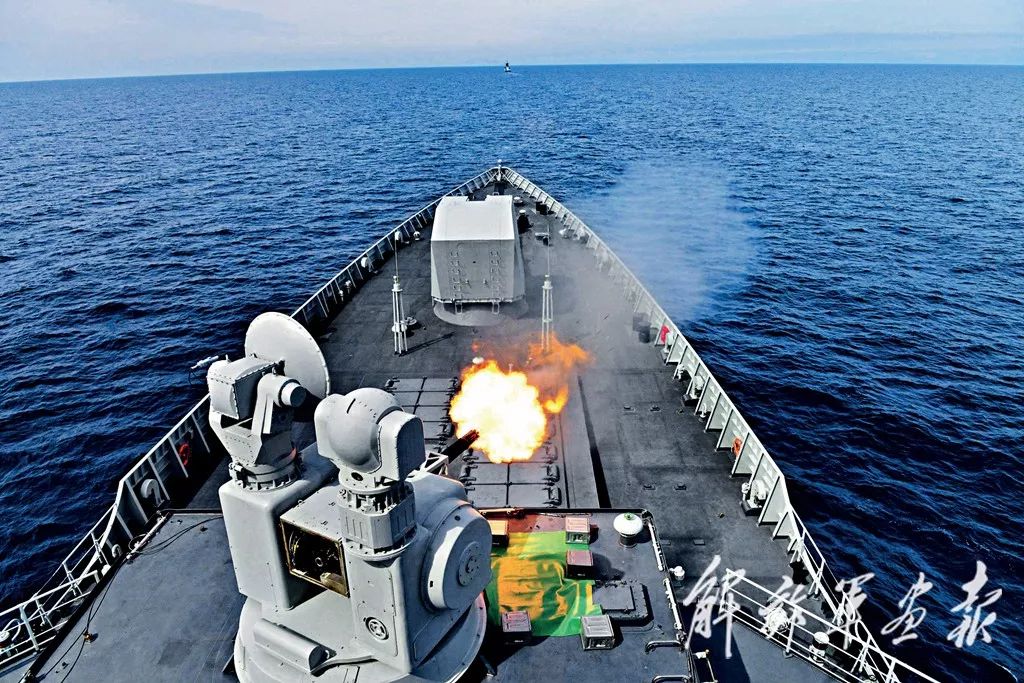 参加演习的双方舰艇编队,在波罗的海某海域组织副炮对海射击演练。