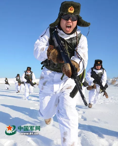 东极边防连官兵在黑瞎子岛上进行冬季拉练,途中开展防暴恐袭击课目演练。杨磊 摄