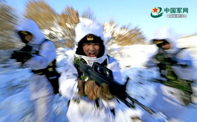 东极边防连官兵在黑瞎子岛上进行冬季拉练,途中开展防暴恐袭击课目演练。杨磊 摄