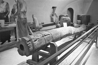 在河北清苑县冉庄地道战遗址,有一门用榆木树干做成的大炮。抗战时期,冉庄地下兵工厂的民兵发挥聪明才智,把一棵生长多年的榆树树干从中间剖开掏空,镶上炮膛再把树干合起,用铁丝箍紧,后面钻上安装导火索的孔,做成了让敌人胆寒的榆木大炮。虽然榆木大炮制作简陋,每次发射都要重新装填弹药,但就是这门土里土气、甚至有些笨拙的大炮,在冉庄民兵对日伪军的作战中发挥了大作用,打出了冉庄民兵的威风,打出了气势。
