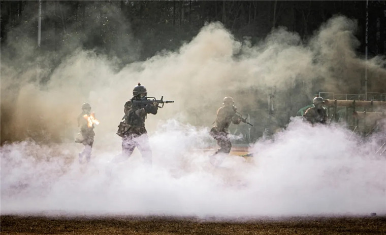 现场烟雾弥漫、火光冲天,枪声、爆炸声不断。