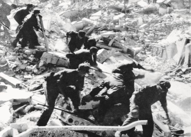 ▲战士们在徒手清理废墟,搬除水泥预制板