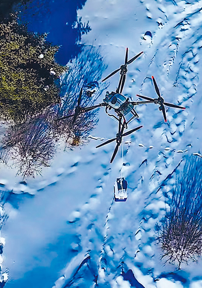 训练中,无人机不仅助力警戒防卫,而且成为投送应急物资的好帮手(图①)。“实战条件下,医疗、装备等物资保障的最后一公里,一直是战场上的难题。”该军代室负责人祁松介绍,他们为无人机配备了吊装保温箱,可进一步提高严寒条件下的保障能力。