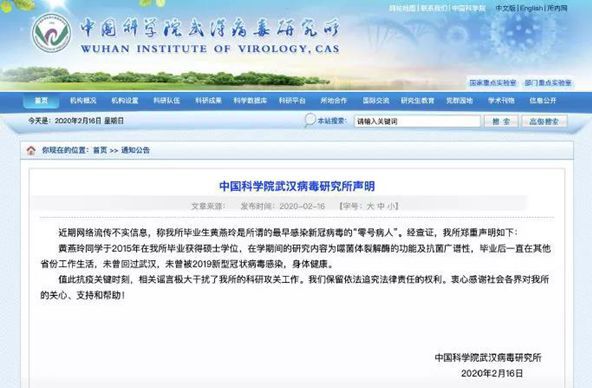 对此,中国科学院武汉病毒研究所发表郑重声明,予以辟谣:黄燕玲同学于2015年在我所毕业获得硕士学位,在学期间的研究内容为噬菌体裂解酶的功能及抗菌广谱性,毕业后一直在其他省份工作生活,未曾回过武汉,未曾被2019新型冠状病毒感染,身体健康。
