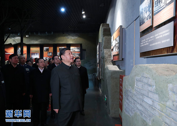 在纪念馆,习近平重点参观了战前形势、战役实施、人民支前等板块,他一边听讲解,一边询问有关细节,不时驻足端详、凝神思考。他强调,我们缅怀革命先烈,为的是继承他们的遗志,发扬他们的精神,不忘初心,牢记使命,在他们用生命和鲜血开辟的道路上不懈奋斗、永远奋斗。习近平指出,淮海战役深刻启示我们,决定战争胜负的未必一定是武器和兵力,军队的战略战术运用、将士们的信心和勇气、人民的支持和帮助,往往是更为重要的因素。我们要传承好人民军队的红色基因,努力培养有灵魂、有本事、有血性、有品德的新时代革命军人,永葆人民军队性质、宗旨、本色。要继承和弘扬我们党和人民军队的光荣传统和历史经验,在坚持和发展中国特色社会主义道路上不断前进。