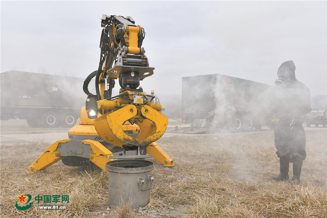 “××地域发生‘放射性沾染’,命令你部立即前往处置!”接到命令后,官兵全副武装迅即出动。“沾染区”现场温度接近-15℃,侦测评估组和压制回收组同步行动,利用新型装备精准采集分析数据,采取多种手段喷射压制去污剂,对“污染源”实施立体封堵和全方位压制。
