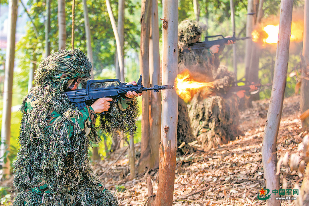 夜幕降临,各组队员默契配合,将目标围困在一个山坳。一声令下,战斗打响。各战斗小组利用爆震弹和火力掩护,多点攻击,一举将“敌”歼灭。