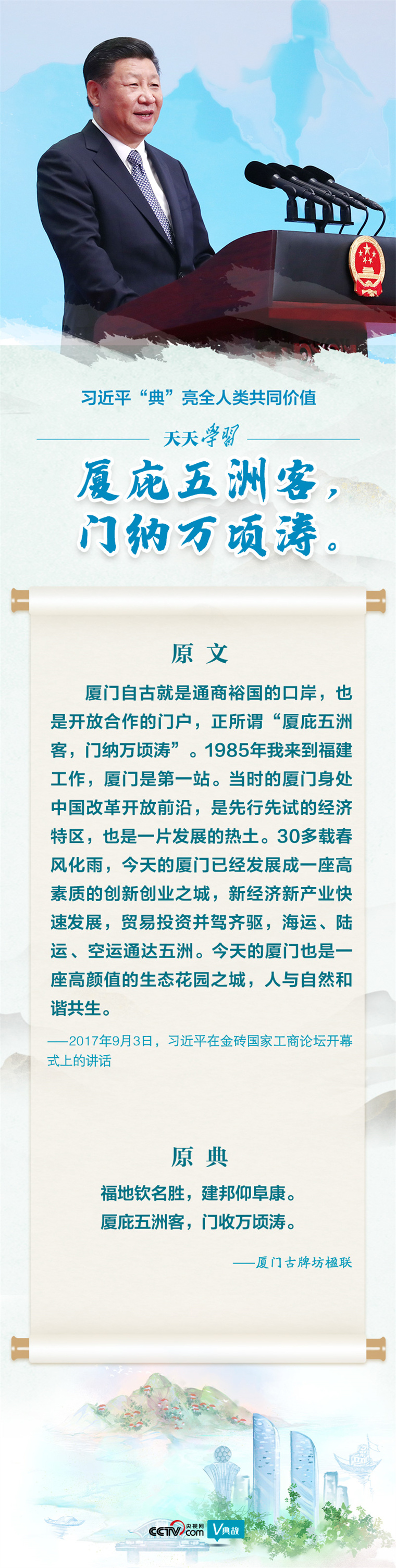 2017年9月3日,在金砖国家工商论坛开幕式上的讲话中,习近平主席引用“厦庇五洲客,门收万顷涛”这一著名联语,并将下联化用为“门纳万顷涛”。“纳”既有收入之义,又有接受之义;既反映客观现实,又包含主观能动。强调厦门乃至中国以海纳百川、有容乃大的气魄,接受八面来风、盛待五洲宾朋,赋予原典以新的时代内容,可谓一字妙改见匠心。