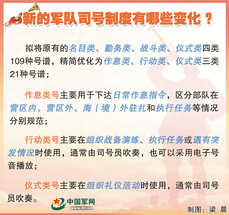 ——司号工作领导管理制度新。根据军队领导指挥体制和军号功能作用的调整变化,这次由中央军委训练管理部牵头负责司号工作。新的军队司号制度采取兼职为主、专职为辅的方式,调整编配司号员,在保留传统军号的基础上,研发新型军号和电子号音播放系列设备。