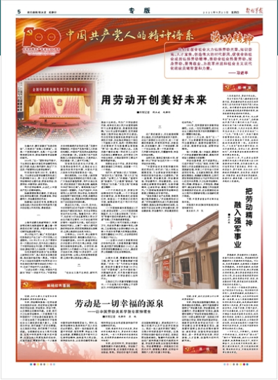 作为中国共产党人精神谱系的重要内容,劳动精神始终流淌在包括革命军人在内的所有中国共产党人的血液里。她闪耀着创造物质财富的魅力,她描绘着实现美好梦想的图景,她演奏着昂扬奋进的时代强音。