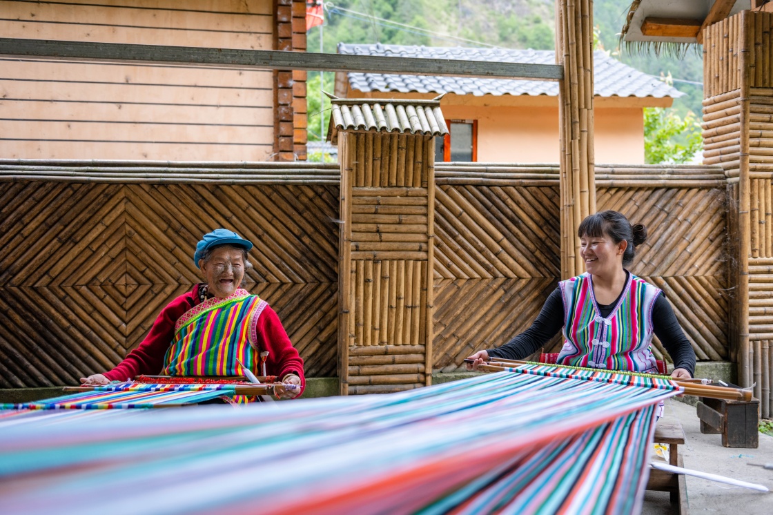 在云南省贡山独龙族怒族自治县独龙江乡迪政当村,独龙族老人李文仕(左)和女儿在编织独龙毯(2022年5月10日摄)。新华社记者 曹梦瑶 摄