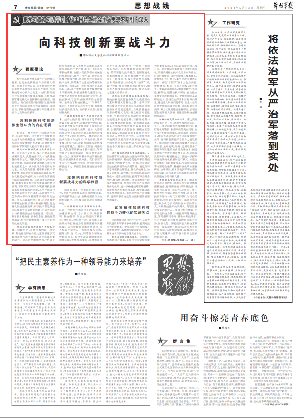 科技创新是发展新质生产力的核心要素,也是生成新质战斗力的强大引擎。党的十八大以来,习主席深刻把握新军事变革和强军兴军内在规律,作出科技是核心战斗力的重大论断,鲜明提出并全面实施科技强军战略,不断推动我军建设模式向创新驱动发展转变。新征程上,我们必须坚持创新驱动,推动新质生产力同新质战斗力高效融合、双向拉动,不断提高科技创新对军队建设和战斗力发展的贡献率。