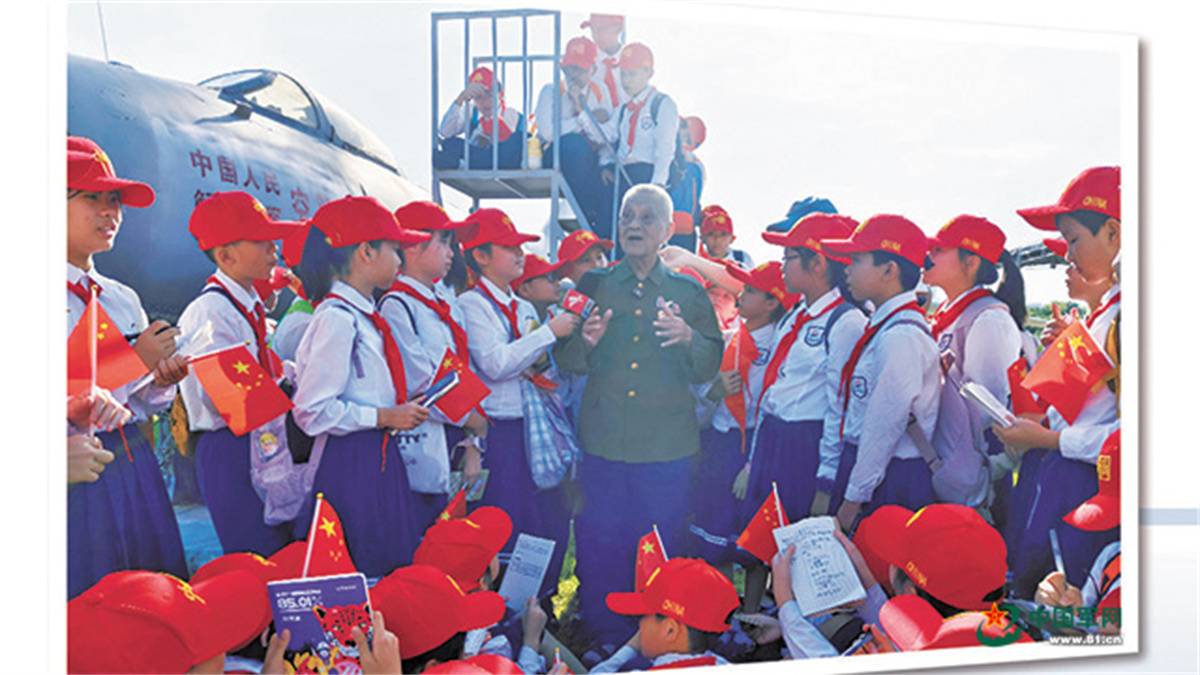 湛江军事文化博览园内,原空军特级飞行员田欣民为学生讲述战斗故事。顾桥红摄