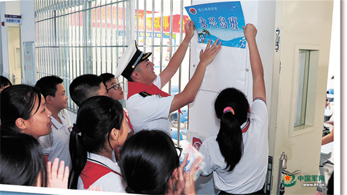 和海军官兵一起将“永兴岛班”的标牌挂在门口,湛江南海学校七年级一班学生们的脸上写满自豪。