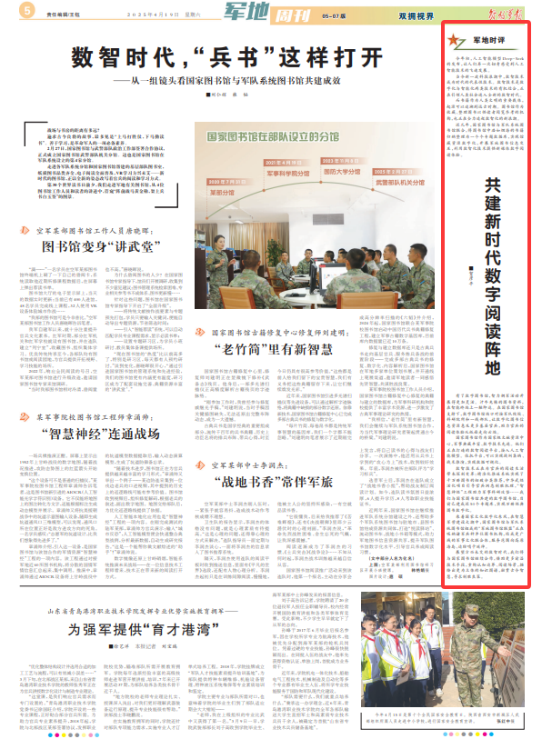 数智技术正在为官兵的阅读生活带来深刻变革:精准化推送系统实现了千万册图书的细致分类推荐,中华武经活化项目引导官兵洞悉制胜机理,“智慧神经”工程助力军事科研攻坚……我们与国家图书馆共建的数字图书馆,目前已建成近50个专题库,实现万册经典图书数字化。