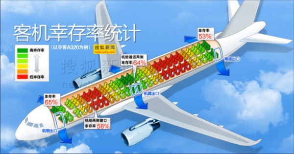 调查发现,在飞机起火燃烧时,生存几率最高的座位是紧急出口处及其前后各一排的座位。在距离紧急出口两排至五排座位之内的乘客,生还几率高于平均几率。