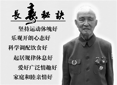 在纪念中国人民抗日战争暨世界反法西斯战争胜利70周年阅兵仪式上,当抗战老兵乘车方队经过天安门时,吸引了众多崇敬的目光。前来参加阅兵的抗战老兵代表虽已至耄耋之年,但他们个个精神矍铄、神态安详、行动自如。战争年代,他们缺衣少食,生活条件异常艰苦;和平时期,他们粗茶淡饭,过着普通的百姓生活。这些历经苦难的老兵为什么能够如此长寿健康?本版即日起开设“百岁抗战老兵的长寿秘诀”专栏,让我们走近这些百岁或接近百岁的寿星,聆听他们长寿的体会和感悟。