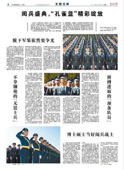 今年国庆阅兵,身着礼服、头顶“文”字帽徽的文职人员方队,昂首阔步走过天安门广场,气势恢弘,步伐刚劲……文职人员方队,是15个徒步方队中具有鲜明特色的方队之一,首次亮相阅兵场,格外引人注目。这从一个侧面反映了构建中国特色现代军事力量体系的创举,展现了党的十八大以来我军适应世界新军事革命、全面实施改革强军战略的巨大成就。请关注今日出版的《解放军报》的详细报道——
