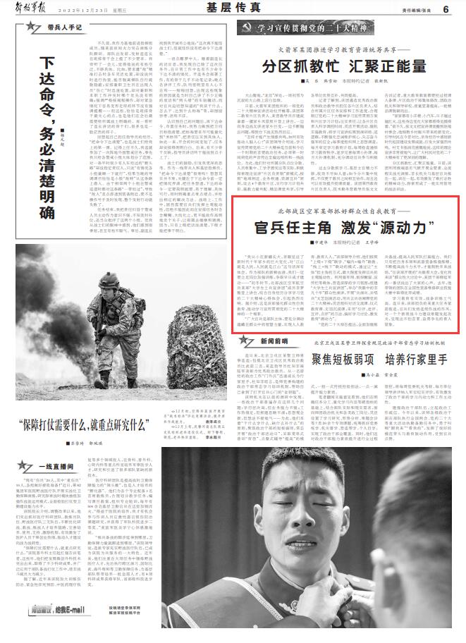 “广大官兵是部队主体,要充分调动蕴藏在群众中的智慧力量,实现人人教育、教育人人。”该部领导介绍,他们按照“上级+下级”联学、“编内+编外”联教、“线上+线下”联动的模式,通过让“主体”担主角的方式,最大限度发挥官兵的主观能动性。利用强军网、板报橱窗、宣传栏等载体,营造浓厚的学习氛围;组建“大学生士兵宣讲团”,举办“我眼中的非凡十年”群众性演讲,开展“兵演兵、兵唱兵”文艺创演活动,用兵言兵语阐释党的二十大精神;灵活组织对话交流课、仪式教育课、史馆沉浸课,采用“引评、述评、互评、点评”的方法,搞好学习讨论,激发教育“源动力”。