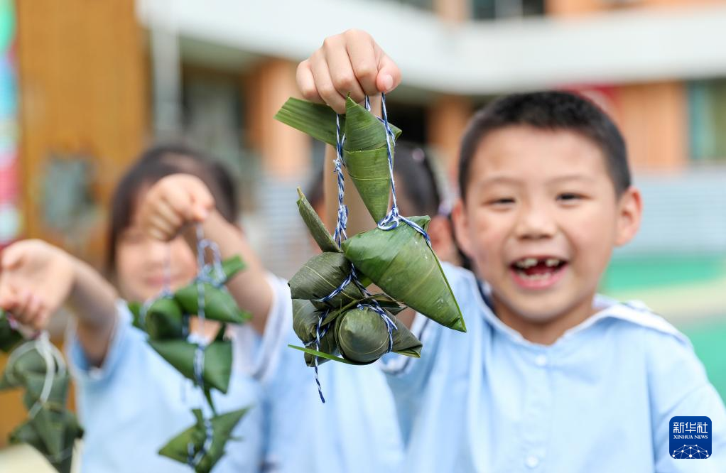 6月5日,四川省华蓥市杜家坪幼儿园的小朋友展示自己包的粽子。新华社发(邱海鹰摄)
