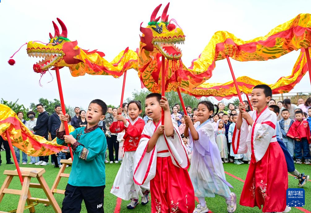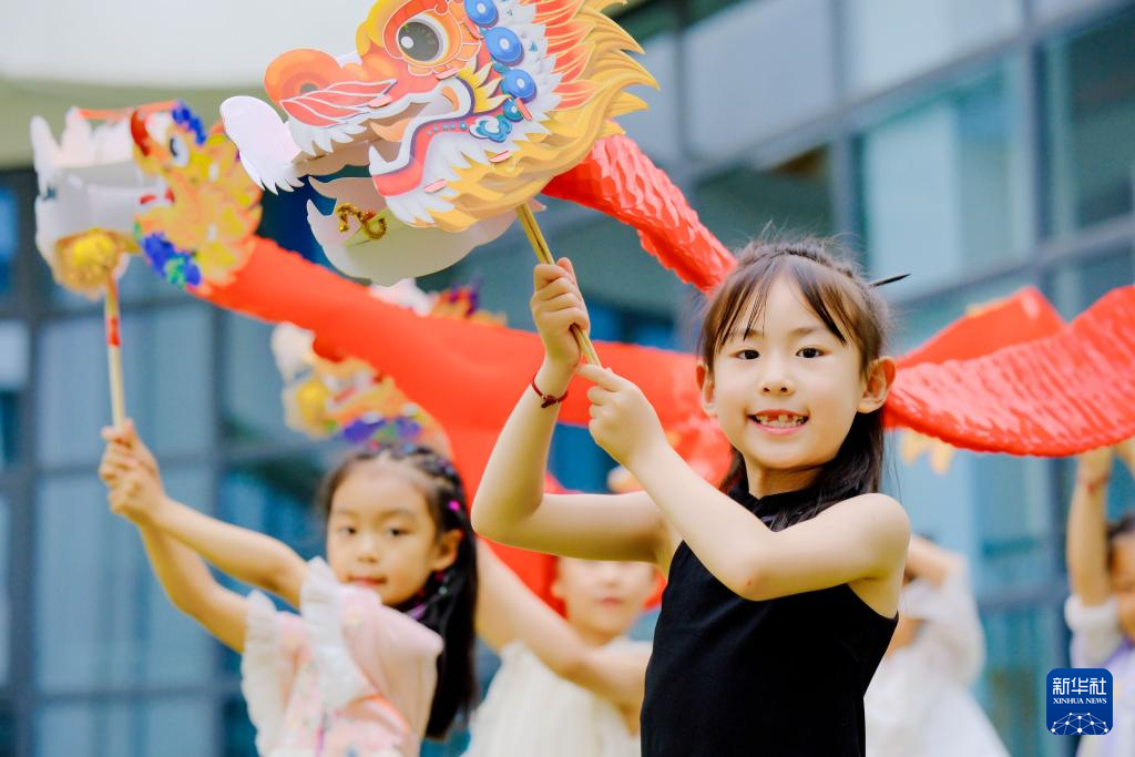 6月5日,河南省济源市第一幼儿园的小朋友在体验舞龙。新华社发(段二平摄)