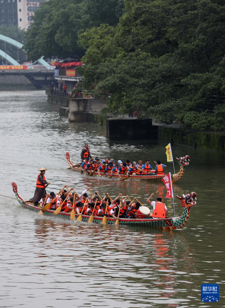 6月5日,龙舟队员在福建省龙岩市龙津河参加龙舟竞渡。新华社发(周杨东摄)