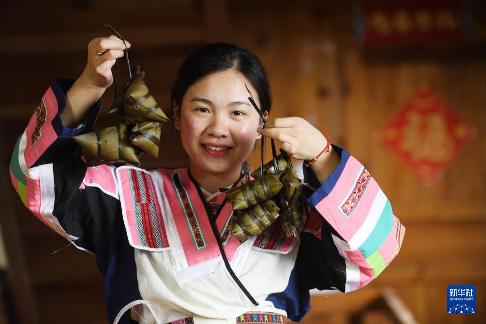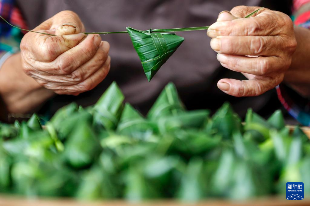 6月5日,广西桂林市龙胜各族自治县三门镇安康村的村民展示刚包好的粽子。新华社发(潘志祥摄)
