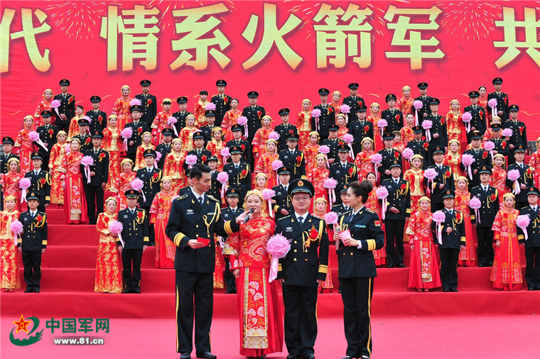 伴随着温馨浪漫的《婚礼进行曲》,一对对新人互赠爱情信物、宣读爱情誓言、讲述爱情故事,新人们在众人的见证下齐声宣誓,内心甜蜜之情溢于言表。祝福声、笑声、欢呼声一浪高过一浪,婚礼现场处处洋溢幸福。新娘刘琼说:“我们的美好时刻既有老公的战友兄弟聚集见证,也有彼此亲人的共同祝福,独树一帜,别具军营特色,这样的集体婚礼让我终身难忘。”